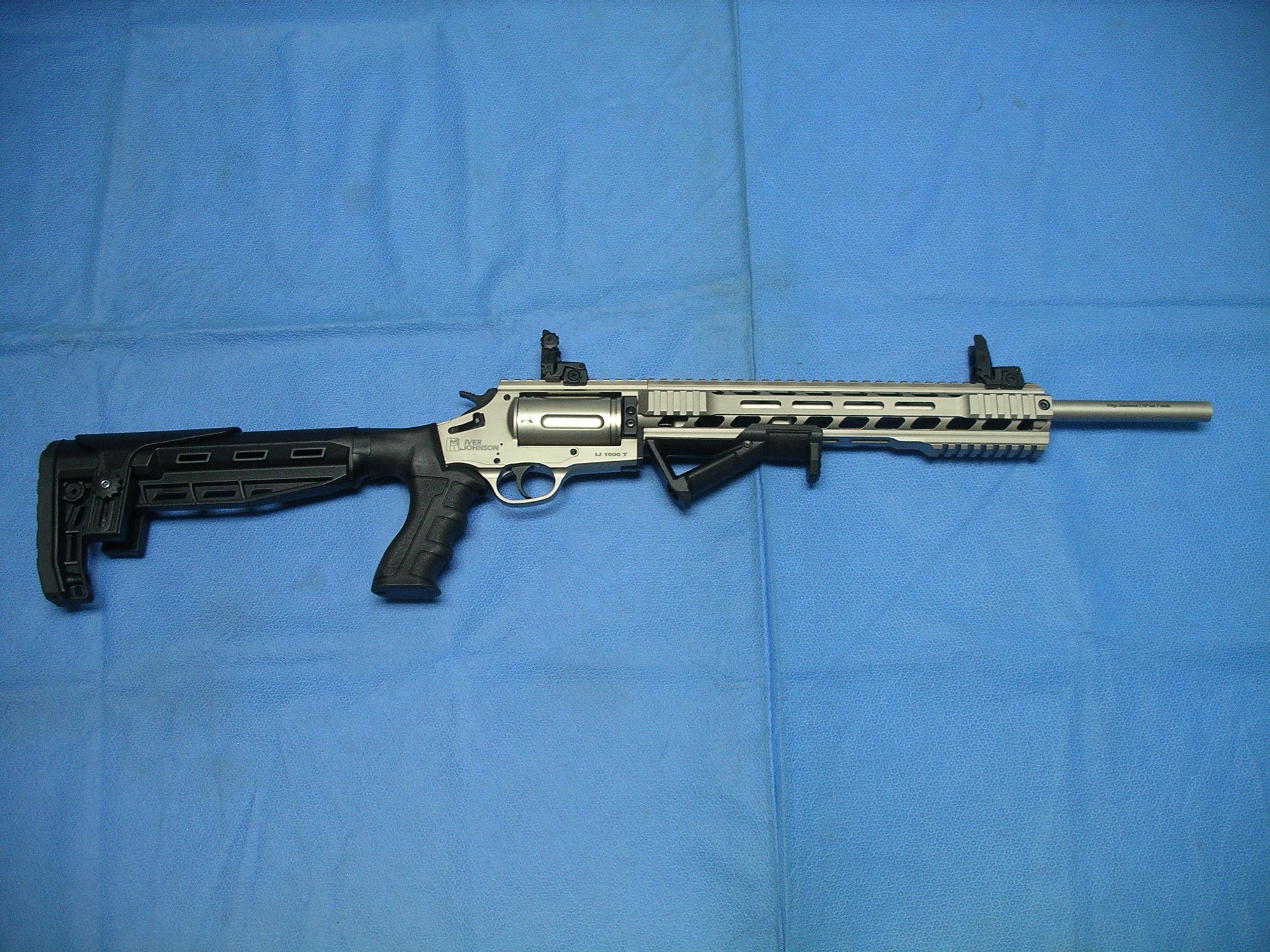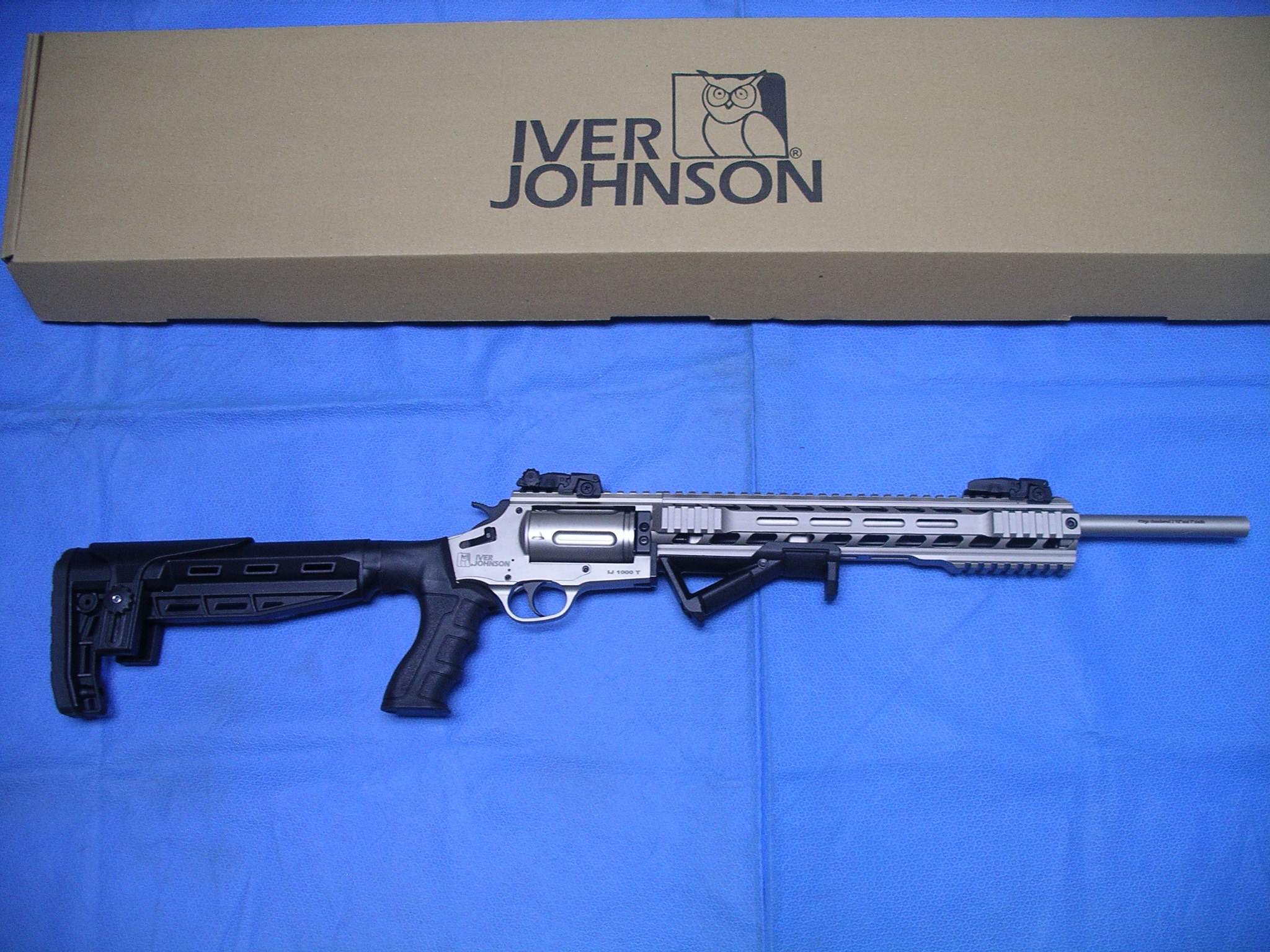 IVER JOHNSON 410 3″ 18.5″, REVOLVER SHOTGUN TACT. NICKEL. This revolver shotgun from Iver Johnson is chambered for .410 Bore with a capacity of 5 rounds. The barrel of this IJ1000 shotgun measures 18-1/2″ in length and reflects the quality firearm craftsmanship expected from Iver Johnson.