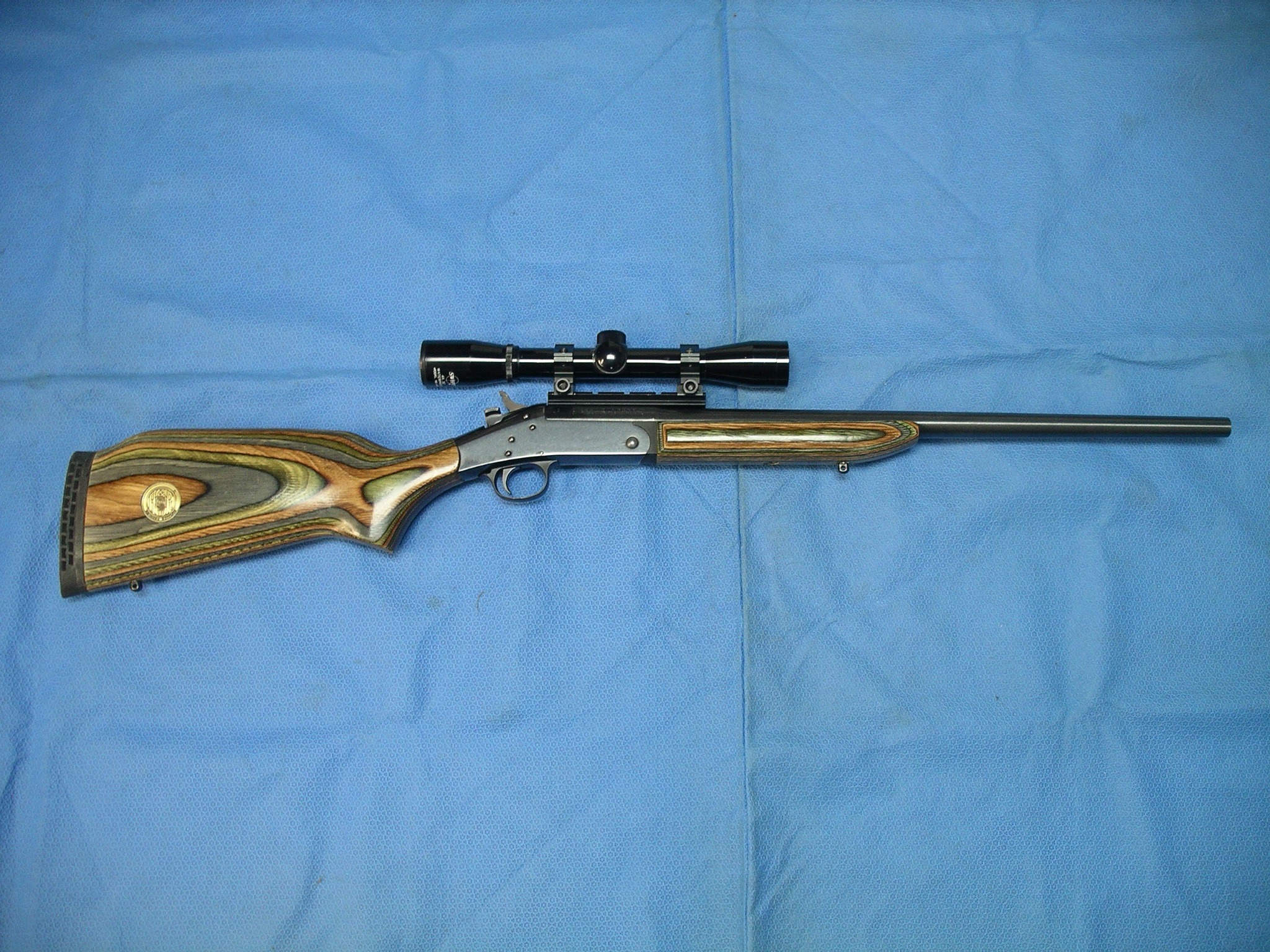 New England, Handi-Rifle, SB2, in 243win. Limited Edition Laminate Green, Brown, Gray stock. 22-inch barrel. Rifle is in great condition With Swift 4X Scope