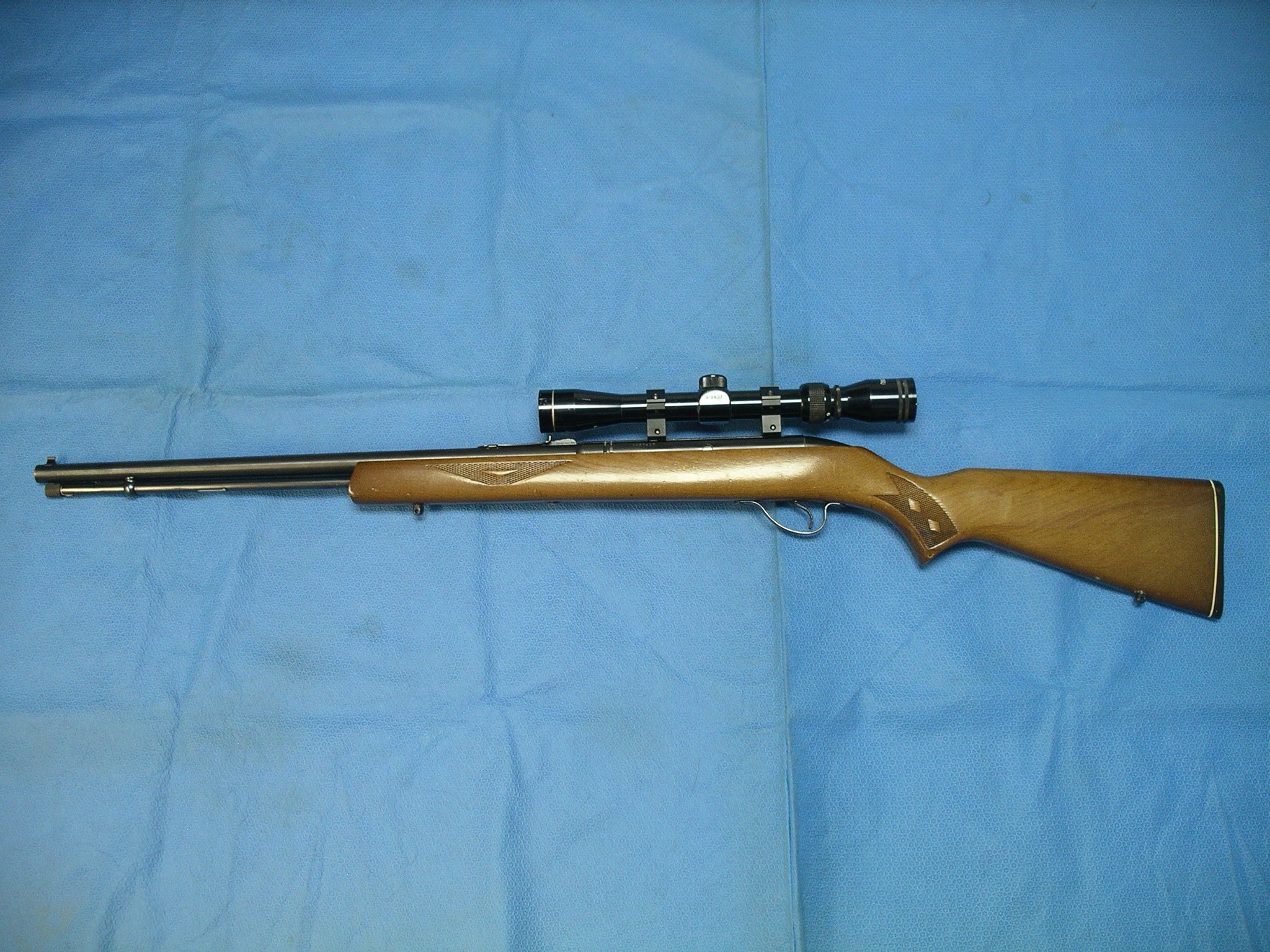 The Model 487T is one of Savage’s rimfire-target/utility designs. In general, Savage’s “4xx” rimfire models were produced as reliable, accurate .22 rifles offered in both target and sporting rifles. This rifle has a dove tail mounted Tasco 3-9 scope mounted, and has the original sights as well, all traits that make the 487T well-suited to plinking, training new shooters, and small-game hunting.
