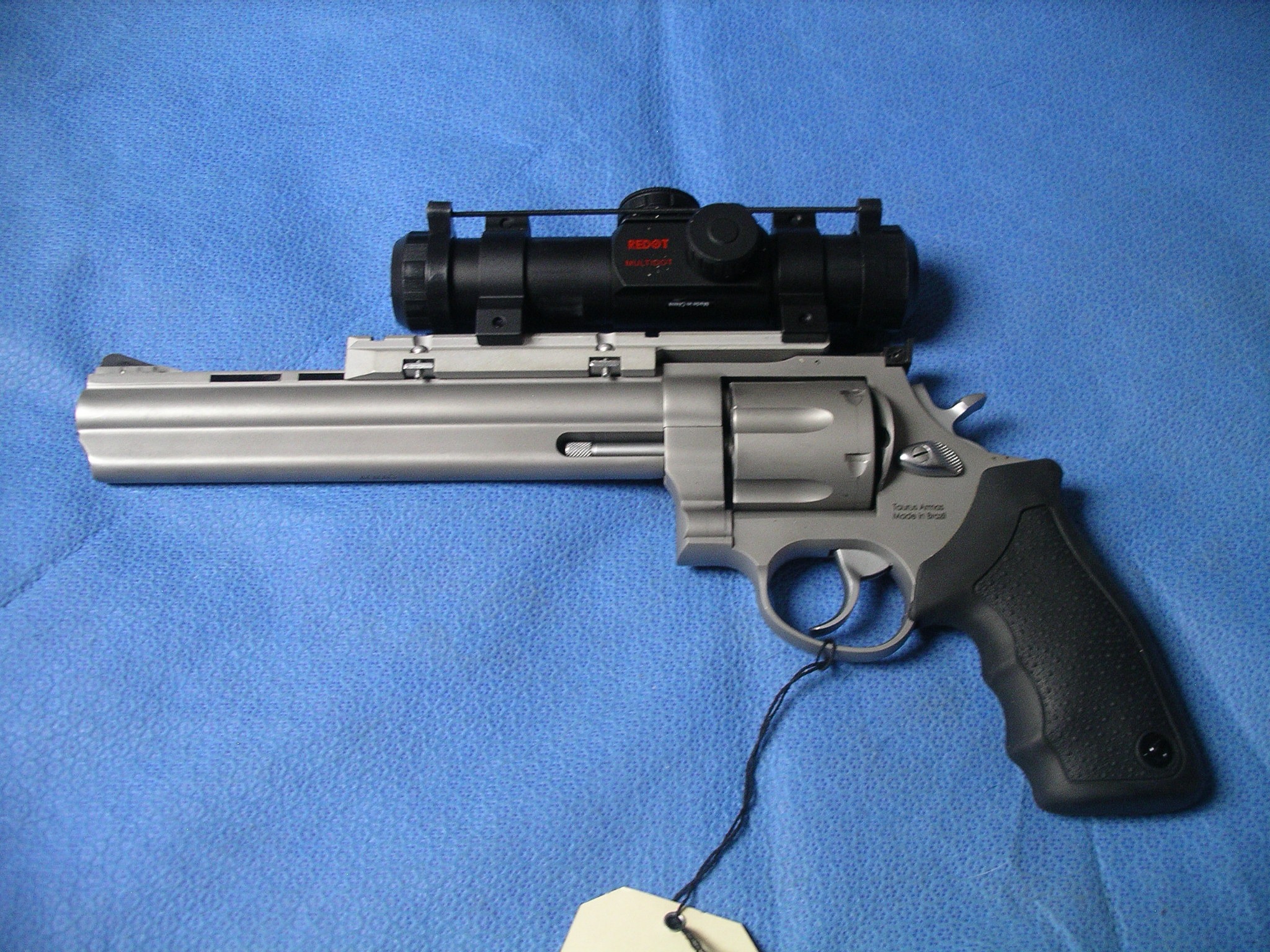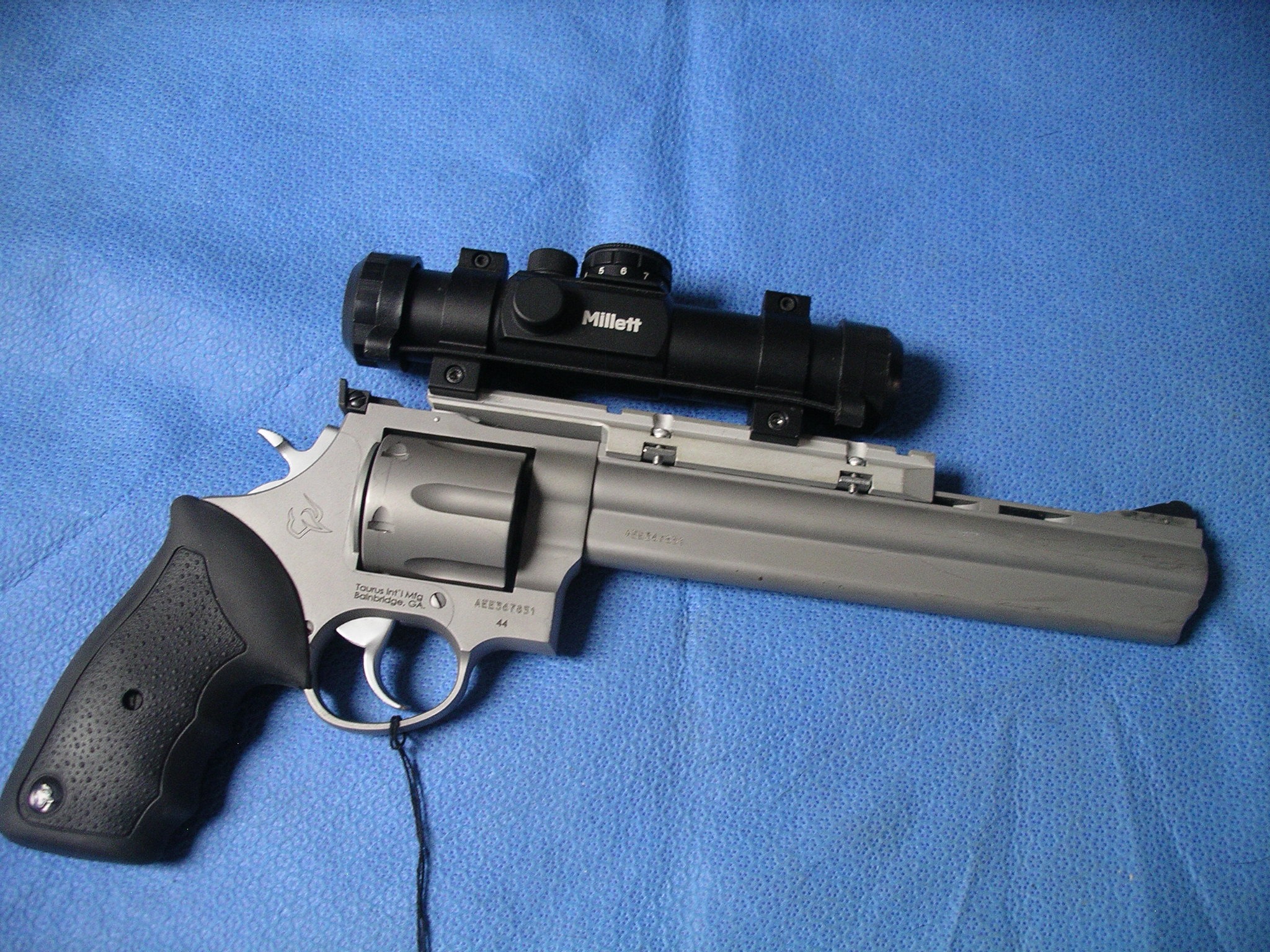 TAURUS 44 REM MAG 8.35″ 6 round Revolver – Stainless / Rubber Grips and Millett red dot scope mounted.